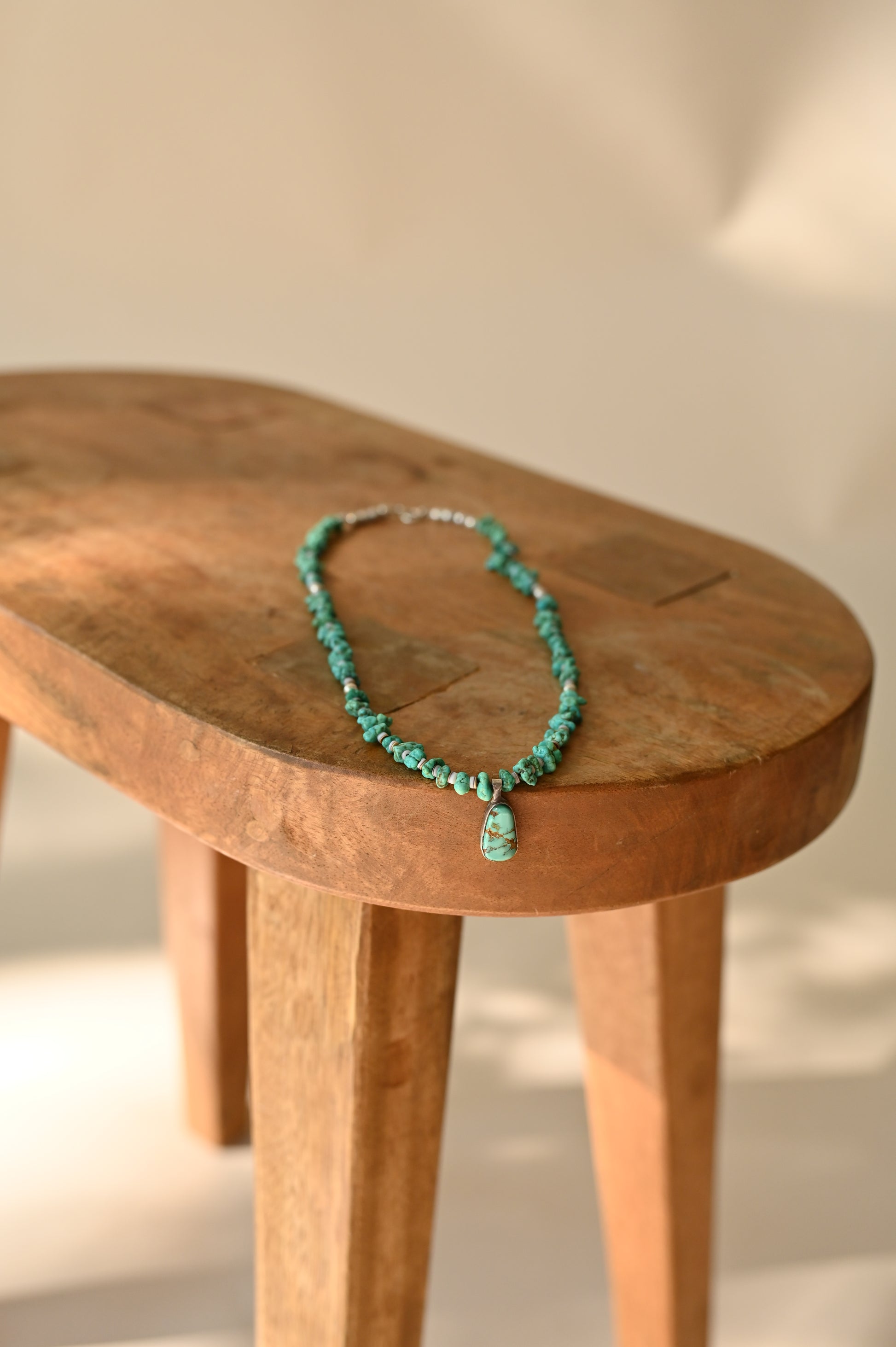 This 18-inch necklace features a handcrafted pendant with natural Royston turquoise, woven together with Sterling Navajo Pearls to create a ribbon of ancient energy and timeless beauty. The vibrant blues and greens of Royston turquoise meet the soft shimmer of heishi shell, symbolizing harmony between desert stone and ocean spirit.