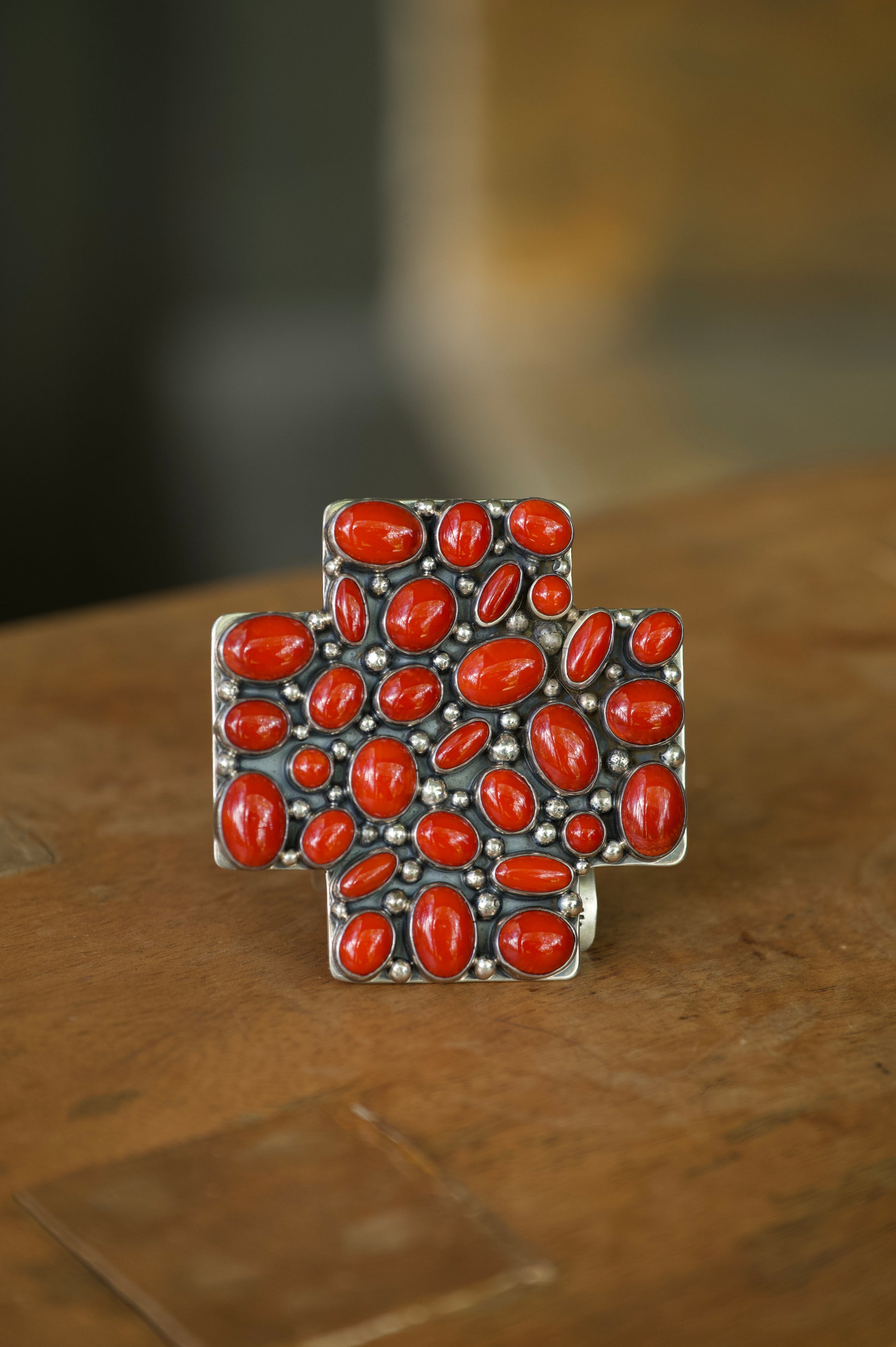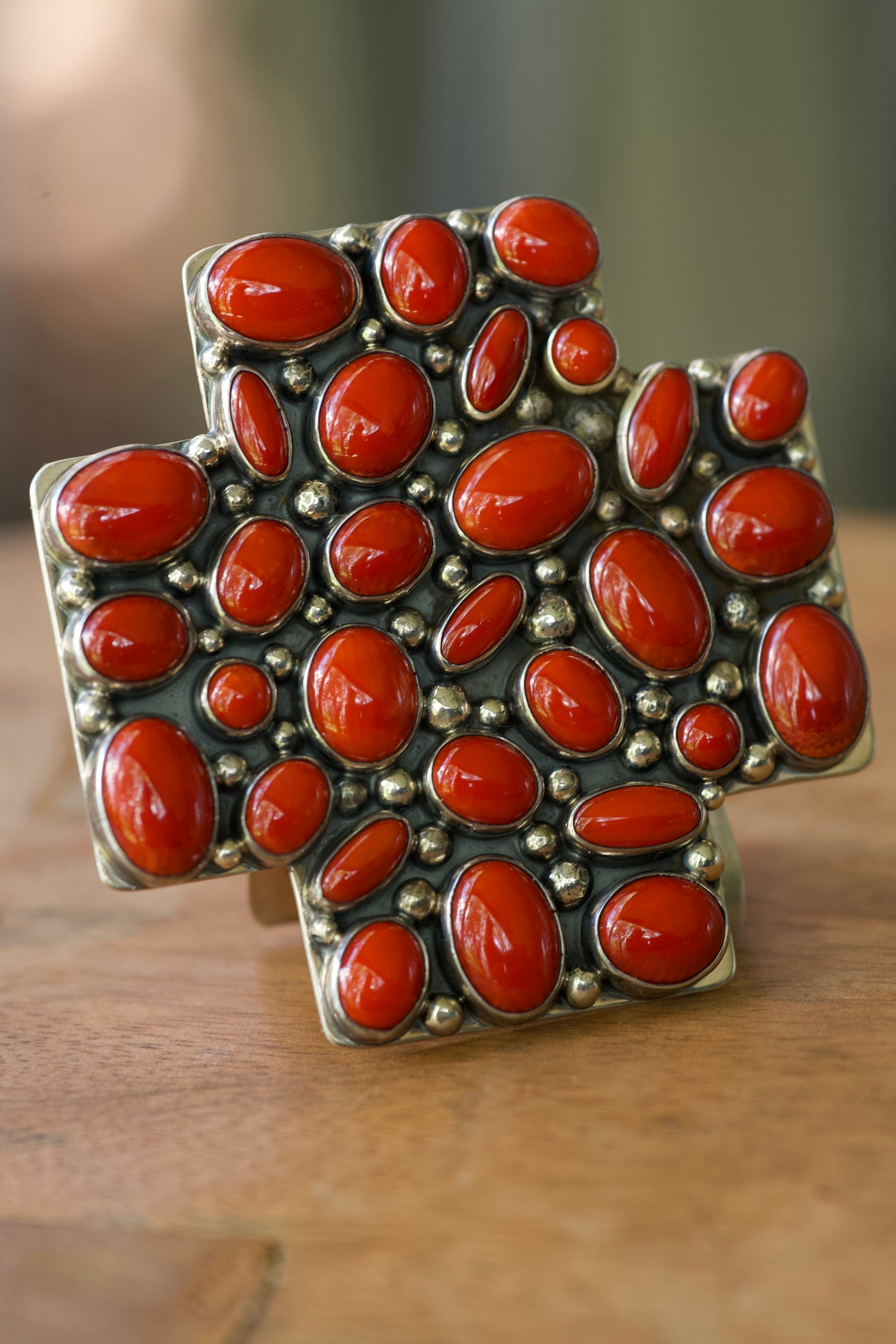 This bold, handcrafted belt buckle is a true statement piece. Set in sterling silver, it features a striking cross design adorned with vibrant, natural red coral stones of varying shapes and sizes. Each stone is carefully bezel-set and accented with sterling silver drops, creating a textured, organic flow across the piece.