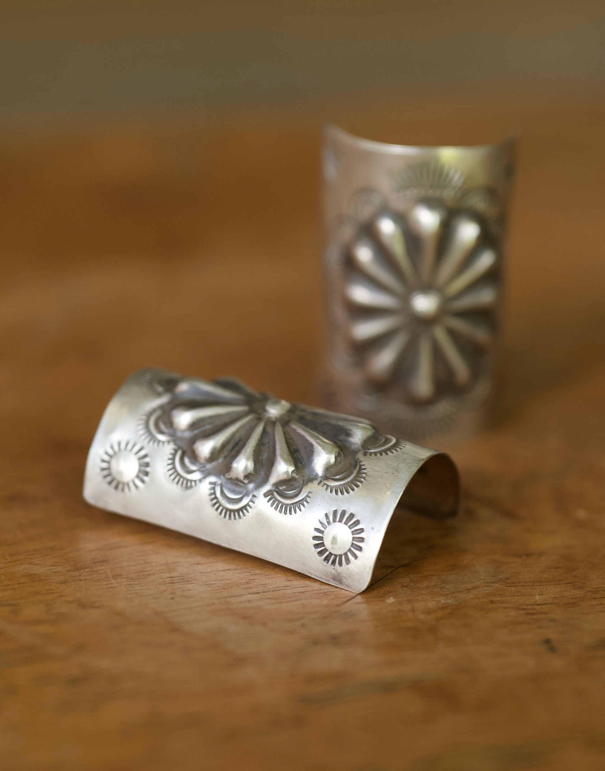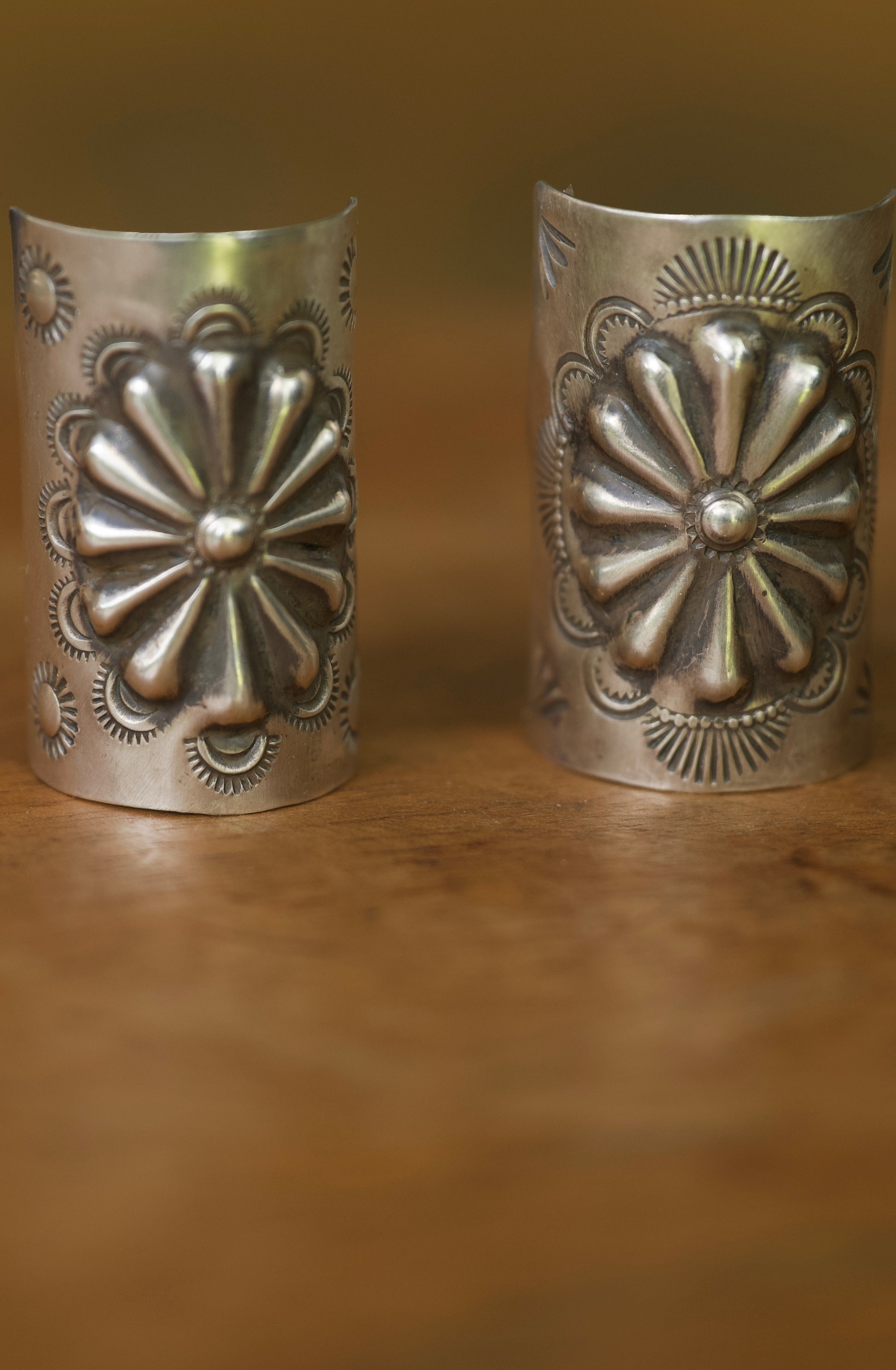 These sterling silver hair cuffs are a bold way to elevate any style. Each one is hand-stamped and formed by hand, featuring a raised repousse flower at the center surrounded by traditional stamp work. Because every cuff is individually crafted, the stamped patterns will vary slightly from piece to piece, making each one truly unique.